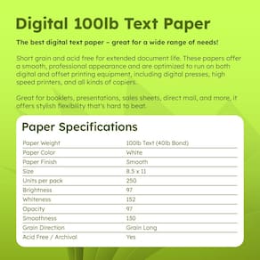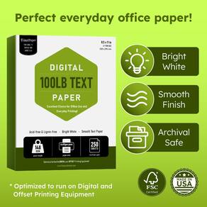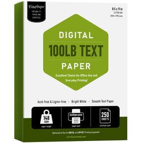 Papel de texto digital de alta qualidade de 100 libras — Ótimo para uma ampla ampla variedade de necessidades! Sem grão longo e sem ácido para prolongar a vida útil do documento, esses papéis oferecem uma aparência suave e e funcionam perfeitamente em equipamentos de impressão digital e offset, incluindo impressoras digitais, impressoras de alta velocidade e todos os tipos de copiadoras. Ótimo para folhetos, apresentações, planilhas de vendas, mala direta e muito mais! Sua flexibilidade e durabilidade o tornam uma excelente escolha para uso em escritório e impressão diária!