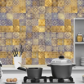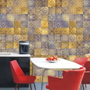 Papel de parede azulejo azul e dourado cozinha e lavatório