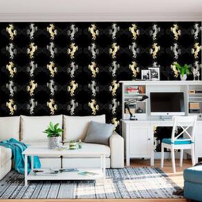 Papel De Parede Cavalo Dourado E Cinza Fundo Preto Adesivo