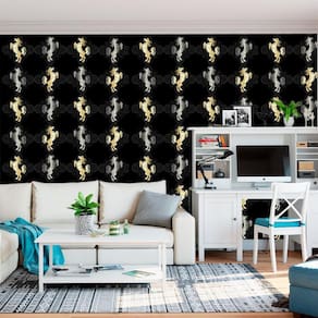 Papel De Parede Cavalo Dourado E Cinza Fundo Preto Adesivo