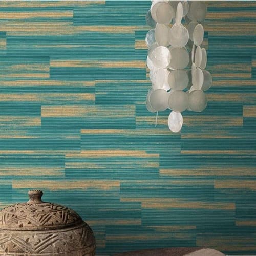Este papel de parede tem um padrão com elementos da natureza, e vem em uma variedade de tons is e cores marcantes.
