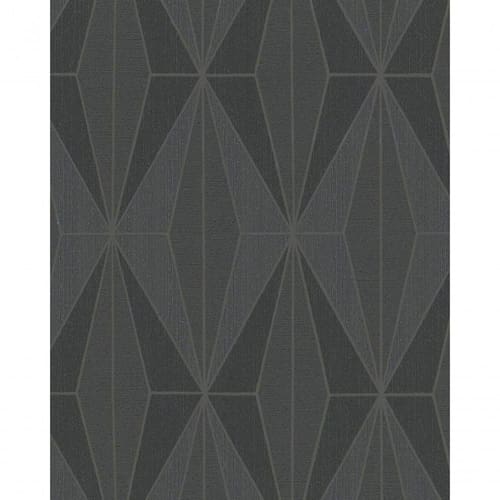 Esse papel de parede é único, já que combina desenhos de diamantes alongados e arcos arredondados em um único conjunto. Uma reminiscência do estilo Art Déco dos anos 1920. Aqui, a tonalidade cinza grafite confere um ar impressionante ao motivo.