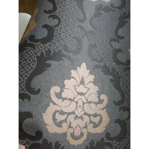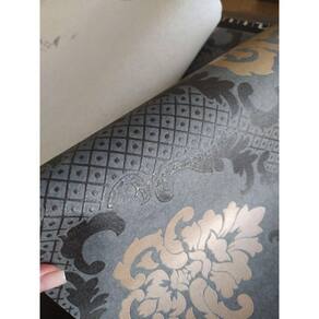 Papel de parede Lavável Mod.Ga60305. Fundo verde com arabesco preto e dourado/bronze. Rolo com 5m²(53 cm de largura e 10 meros de comprimento).