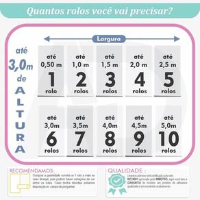 Tamanho do rolo: - altura: 3 metros - largura: 50 cm - cada rolo cobre 1,50 m². Onde posso aplicar - pode ser aplicado em qualquer superfície lisa como paredes, madeiras, mdf, vidros, metais, gesso, azulejos, móveis, porta, etc. - não aplicar em superfícies úmidas, porosas, texturizadas ou com relevo. Quantos rolos devo comprar - em paredes com até 3 metros de altura: divida a largura da parede por 0,50. Arredonde o resultado para cima e será a quantidade de rolos necessários. Veja abaixo um exemplo do cálculo: Em uma parede com 2,40 metros de largura: 2,40 / 0,50 = 4,80 Arredonde o resultado para cima e será a quantidade de rolos necessários. No exemplo acima: 5 rolos. Ficha técnica - Idade: Adultos - Largura: 50 CM - Tipo: Vinílico - Comprimento: 3 M - É faixa: Não - Unidade de venda: Rolo - Cor secundária: Branco - Rendimento: 1.5 m² - Ambiente: Sala Marca: Artetik Digital
