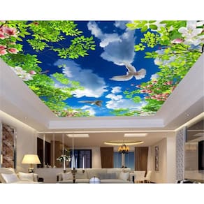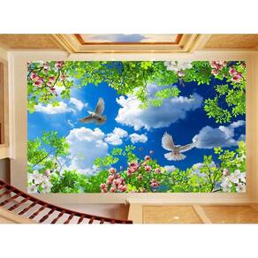 Papel De Teto Céu Azul Nuvens Flores Pombas 3,5M Rof40