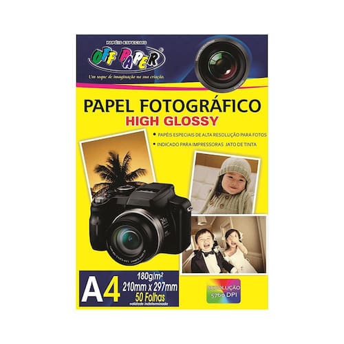 Papel Fotográfico High Glossy A4 180Gr 50 Folhas Off Paper Com uma alta resolução de 5760 dpi para impressão de fotografias e exames médicos. Indicado para impressoras Jato de Tinta. Obs.: Não é dupla face. Ean: 7898306081327