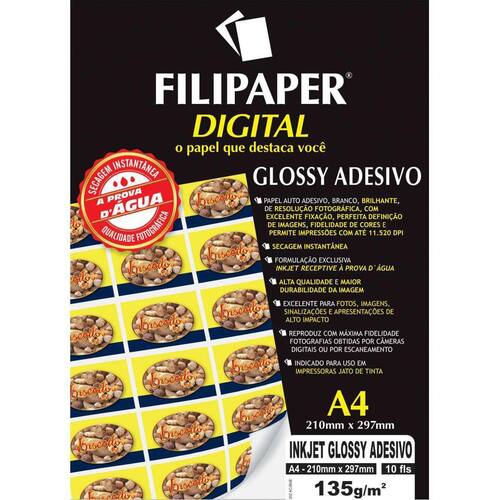 Papel fotográfico inkjet a4 glossy adesivo 135g Papel auto adesivo, branco, brilhante, de resolução fotográfica, com excelente fixação, perfeita definição de imagens, fidelidade de cores e permite impressões com até 11.520 dpi. Secagem instantânea. Formulação exclusiva inkjet receptive à prova d´água. Alta qualidade e maior durabilidade da imagem. Excelente para fotos, imagens, sinalizações e apresentações de alto impacto. Reproduz com máxima fidelidade fotografias obtidas por câmeras digitais ou por escaneamento. Indicado para uso em impressoras jato de tinta. Embalagem: Pacote com 10 Ean: 7891634025544