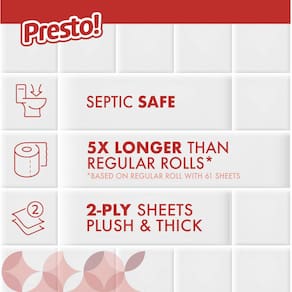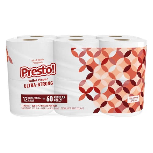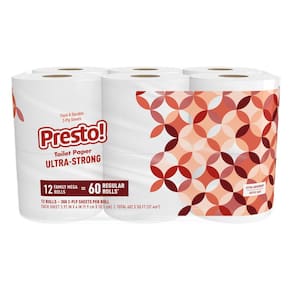 Marca Presto! - Papel Higiénico Ultra Resistente de 2 Capas, 12 Rollo Mega equivalente a 60 rollos normales, 308 hojas por rollo (paquete de 12), sin aroma. - EN LA CAJA: 12 rollos mega equivalentes a 60 rollos normales (basado en rollo estándar de 61 hojas) - Nueva tecnología de fabricación, misma calidad excelente, misma cantidad de hojas - HOJAS POR ROLLO: 308 hojas de 2 capas por rollo de papel higiénico - ULTRA RESISTENTE: Hasta 80% más grueso y fuerte (comparado con la marca líder de 1000 hojas) - SEGURO PARA SISTEMAS SÉPTICOS: el papel es seguro para usar en sistemas sépticos - Marca Presto!, las bolsas contienen 20% de materiales reciclados post consumo.