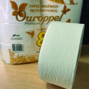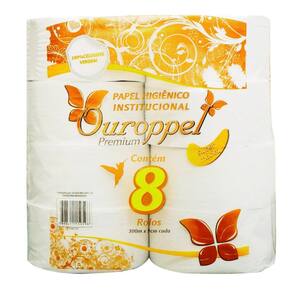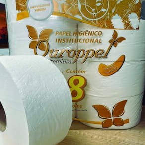 Papel higienico rolao 8x300m ouroppel premium 9cm folha simples - ean 7898611150596 Papel higiênico rolão extra luxo 8x300m ouroppel premium folha simples Marca: ouroppel Tipo: rolão 9cm x 300m cada rolo Institucional. 9cm largura Gramatura: 18g Papel: 100% fibras celulosicas Utilizado quase sempre em locais com um número elevado de pessoas; Hospitais, clinicas, escritórios entre outros.