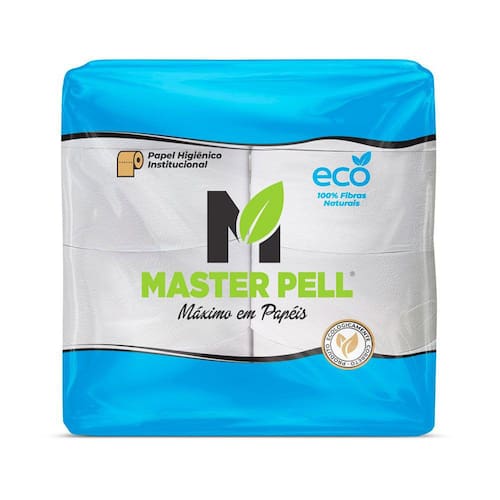 Fardo plástico com 8 rolos. Papel produzido com 70% de aparar recicladas selecionadas, cor branco acinzentado, com adição de resistência à umidade.