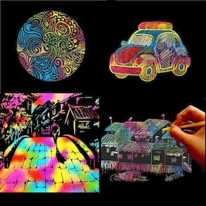 Permite que você desenhe com o bastão, já incluído no produto, arranhando a superfície e fazendo com que a criatividade apareça no papel. Para todas as idades, produto atóxico. As crianças se divertem, os adultos relaxam e todos adoram