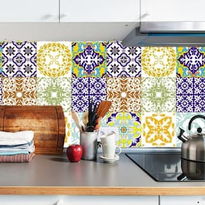 Papel parede azulejo tons amarelo e azul cozinha lavatório