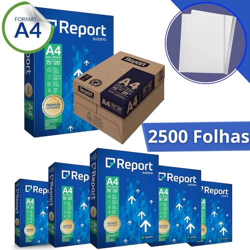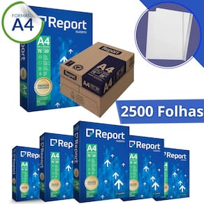 Folha Sulfite A4 Report. Total de 5 Resmas (Pacotes). Cada Resma com 500 Folhas, totalizando 2500 Folhas o Kit.