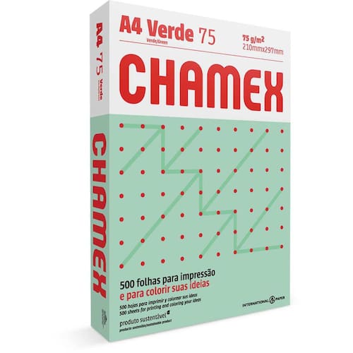 Papel Sulfite A4 Colorido Chamex 75G Verde Chamex Colors é um papel produzido com fibras virgens de eucalipto e tratadas com pigmentação especial, personalizado, papel mais colorido e divertido para realizar desenhos e imprimir diversos trabalhos. Sua superfície é resistente, possui corte perfeito e absorção equilibrada que permite o melhor deslizamento na impressora e alta performance em qualquer atividade. Marca: Não Informado Ean: 7891173006981