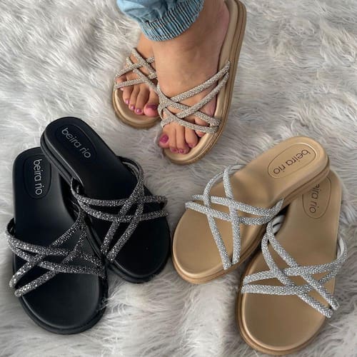 Uma tendência super em alta para estação são os sapatos que apresentam detalhes em brilhante. O detalhe leva o produto básico ao requintado e traz charme e modernidade ao look. Seu cabedal é confeccionado em material sintético e com as tiras em strass, que fazem toda diferença na composição da sandália. Sua palmilha é confeccionada em EVA, que proporciona muita leveza à peça e conforto ao utilizá-la. Seu solado é do tipo antiderrapante e possui frisos que garantem segurança ao andar. Altura do solado - 2,6 cm Se você quer um produto para arrasar e ainda usufruir de muito conforto, este é o produto ideal para você.