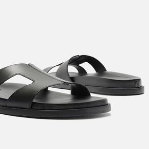 Papete feminina preta com design minimalista e elegante.. Confeccionada em material de couro, possui tira larga com recortes geométricos que garantem estilo e respirabilidade.. O solado é reto, levemente elevado, proporcionando conforto e estabilidade no uso diário.. Versátil e moderna, combina com looks casuais, urbanos e até produções mais arrumadas para dias quentes..