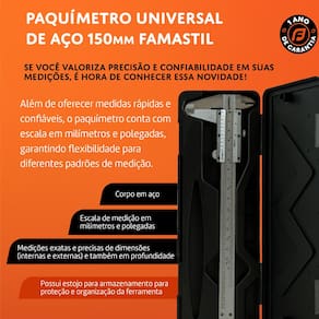 O Paquímetro de Aço Universal 150mm Famastil é a ferramenta para medições profissionaisda indústria, construção civil. Com uma faixa de medição máxima de 150mm e resolução de 0,05mm sendo resistente. Além disso, ele acompanha um estojo para auxiliar no armazenamento e transporte.