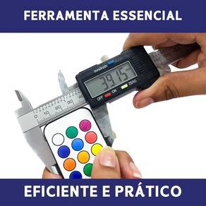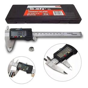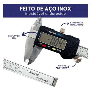 Descrição do Produto: Paquímetro digital confeccionado em aço inoxidável, com funcionamento por meio do deslocamento do cursor móvel sobre a haste da ferramenta, exibindo as medições no display LCD. Acompanha caixa plástica com espuma de borracha no interior, para armazenamento e proteção contra impactos.