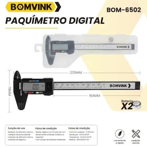Paquímetro Digital Bomvink BOM-6502 O paquímetro digital Bomvink BOM-6502 é um instrumento de medição linear projetado para oferecer precisão e praticidade em medições internas, externas, de profundidade e de ressalto. Com uma faixa de medição de 0 a 150 milímetros ou 6 polegadas , o modelo é ideal para aplicações gerais em ambientes domésticos, educacionais, técnicos e em pequenos trabalhos profissionais. Este modelo conta com um visor LCD digital que proporciona leituras claras e imediatas. A resolução de 0,01 milímetro 0,0005 polegada permite aferições detalhadas, e sua precisão típica é de aproximadamente 0,02 milímetro, adequada para medições de baixa a média exigência. O paquímetro BOM-6502 possui estrutura leve, geralmente fabricada com liga metálica ou plástico ABS reforçado, conferindo facilidade no manuseio, embora com menor robustez em comparação com instrumentos industriais de alto padrão. O aparelho dispõe de botões funcionais que permitem alternar entre unidades de medida milímetros e polegadas , zerar a medição em qualquer ponto do curso função zero e ligar/desligar o equipamento. Também conta com sistema de desligamento automático para economia de bateria, que contribui para maior durabilidade energética. A alimentação é feita por meio de uma bateria do tipo LR44 1,5V , geralmente incluída no produto. O compartimento da bateria é de fácil acesso e permite rápida. Em alguns kits, o produto acompanha estojo de armazenamento e chave para abertura do compartimento da bateria, o que facilita seu transporte e proteção contra danos. Apesar de não possuir certificação de proteção contra água ou poeira como o padrão IP67 , o BOM-6502 apresenta desempenho confiável se utilizado com cuidado. Por não ser calibrado de fábrica com rastreabilidade metrológica, não é recomendado para uso em laboratórios, processos industriais críticos ou aplicações regulamentadas por normas rígidas de controle de qualidade. O paquímetro digital Bomvink BOM-6502 é amplamente escolhido por estudantes de engenharia, profissionais de marcenaria, técnicos em eletrônica, mecânicos e entusiastas que buscam uma ferramenta precisa e acessível para medições frequentes no dia a dia.