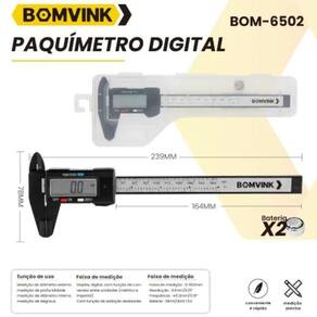 Paquímetro Digital Bomvink BOM-6502 O paquímetro digital Bomvink BOM-6502 é um instrumento de medição linear projetado para oferecer precisão e praticidade em medições internas, externas, de profundidade e de ressalto. Com uma faixa de medição de 0 a 150 milímetros ou 6 polegadas , o modelo é ideal para aplicações gerais em ambientes domésticos, educacionais, técnicos e em pequenos trabalhos profissionais. Este modelo conta com um visor LCD digital que proporciona leituras claras e imediatas. A resolução de 0,01 milímetro 0,0005 polegada permite aferições detalhadas, e sua precisão típica é de aproximadamente 0,02 milímetro, adequada para medições de baixa a média exigência. O paquímetro BOM-6502 possui estrutura leve, geralmente fabricada com liga metálica ou plástico ABS reforçado, conferindo facilidade no manuseio, embora com menor robustez em comparação com instrumentos industriais de alto padrão. O aparelho dispõe de botões funcionais que permitem alternar entre unidades de medida milímetros e polegadas , zerar a medição em qualquer ponto do curso função zero e ligar/desligar o equipamento. Também conta com sistema de desligamento automático para economia de bateria, que contribui para maior durabilidade energética. A alimentação é feita por meio de uma bateria do tipo LR44 1,5V , geralmente incluída no produto. O compartimento da bateria é de fácil acesso e permite rápida. Em alguns kits, o produto acompanha estojo de armazenamento e chave para abertura do compartimento da bateria, o que facilita seu transporte e proteção contra danos. Apesar de não possuir certificação de proteção contra água ou poeira como o padrão IP67 , o BOM-6502 apresenta desempenho confiável se utilizado com cuidado. Por não ser calibrado de fábrica com rastreabilidade metrológica, não é recomendado para uso em laboratórios, processos industriais críticos ou aplicações regulamentadas por normas rígidas de controle de qualidade. O paquímetro digital Bomvink BOM-6502 é amplamente escolhido por estudantes de engenharia, profissionais de marcenaria, técnicos em eletrônica, mecânicos e entusiastas que buscam uma ferramenta precisa e acessível para medições frequentes no dia a dia.
