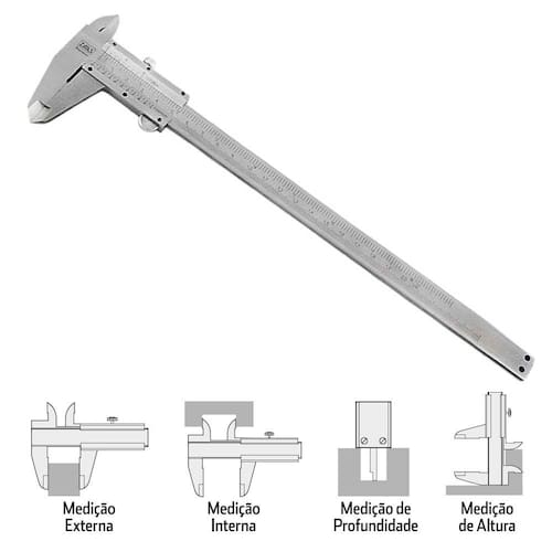 Instrumento de Metrologia Utilizado para medir as dimensões lineares, internas, externas e de profundidade de uma peça. Ideal para fazer medições precisas, tanto para em oficinas, escolas, indústrias e comércio ou uso doméstico ou hobby. Fabricado em aço inox Possui trava e medidor de profundidade Capacidade de medição de 0 a 200mm Graduação superior: 1/128" Graduação inferior: 0,05 mm Exatidão de aproximadamente +-0,05mm Acondicionado em estojo plastico Marca: Não Informado