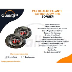 Especificações • Tamanho: 6X9" • Potência RMS Total: 200W • Potência RMS Individual: 100W • Impedância: 4 Ohms • Resposta em frequência (–10 dB): 34 Hz - 20 kHz • Sensibilidade: 91 dB SPL • Material do fio da bobina: Cobre • Dimensional do imã: 72 x 12 mm • Material do cone: IMPP • Material suspenção: Borracha • Material da centragem: Algodão • Material da carcaça: Aço • Garantia: 12 Meses de fábrica