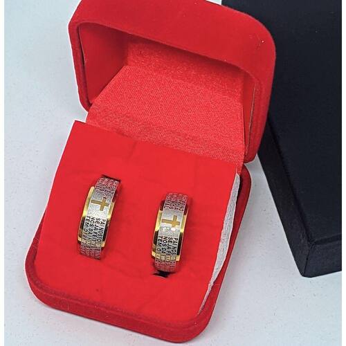 Par de Aliança Anél Oração Pai Nosso em Português Aço Inox 316L Dourado + Estojo Veludo Caixa Porta Jóias Presente