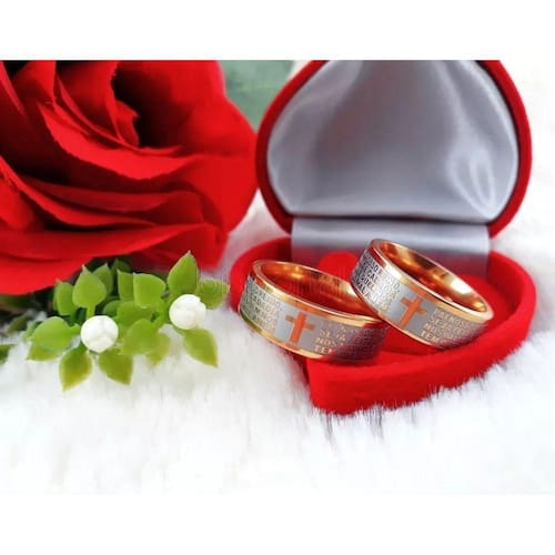 Par de Aliança Anél Oração Pai Nosso em Português Aço Inox 316L Dourado + Estojo Veludo Caixa Porta Jóias Presente