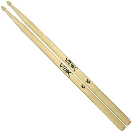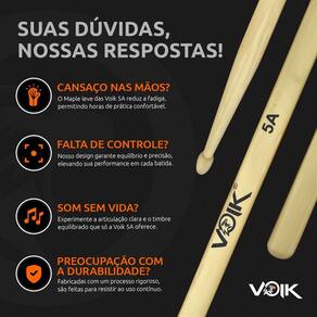 Especificações • Marca: Voik • Modelo: 5A • Madeira: Maple • Formato da Ponta: Oval • Diâmetro da baqueta: 1,8 mm • Diâmetro da ponta da baqueta: 0,8 mm • Comprimento: 40 cm • Peso do par: 68 g