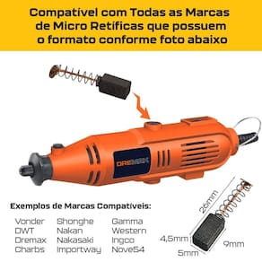 - Marca: Vonder - Embalagem com 1 par - Compatível com grande parte das micro retíficas do mercado, como Charbs, Vonder, DWT, Nove54, Gamma, Western, Ingco, Songhe, Nakan, Nakasaki, Importway, entre outras. - Caso sua retífica não seteja na lista acima, confira as dimensões do carvão com o da sua máquina: - Comprimento total aproximado com a mola : 26mm - Comprimento do carvão: 9mm - Largura do carvão: 5mm - Espessura do carvão: 4,5mm Marca: Não Informado