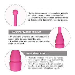 Maça Ginástica Rítmica produzida em termoplástico de alta resistência a impactos, medindo 45cm de comprimento e pesando 150 gramas. Indicada para treinamentos e campeonatos.