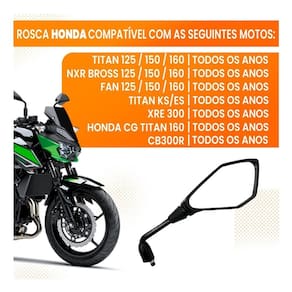 Retrovisor lente convexa para honda modelo kawasaki z400 especificações:- motos compatíveis:- honda cg titan 125/150 todas - honda cg fan 125/150 todas - honda bros 150 todas - honda pop 100 todas - honda biz 125 todas - até 2018 / acima 2018, vide observações abaixo - honda cb twister todas - até 2018 / acima 2018, vide observações abaixo - honda cg 160 todas - vide observações abaixo nas motos cg, titan, fan 160 e nas motos honda acima de 2018 . É necessário remover o adaptador de rosca junto com o retrovisor para instalação deste produto. vide fotos .- medidas: 10 cm de altura da haste- campo de visão: 15,5 x 8cm- fabricação: brasileira produto nacional - material / composição: metal / polipropileno / vidro espelho - código / referência do fabricante: 1157- itens inclusos:- 01 par de retrovisores Marca: Não Informado Ean: 7894242600837