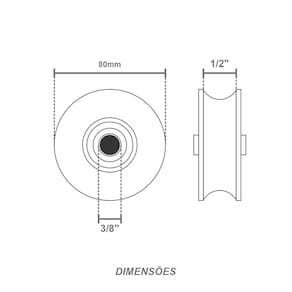 Diâmetro da roldana: 80mmRaio do trilho: ; 1/2''Diâmetro do furo do eixo: 3,8mmPeso médio: 630g unEncaixe do trilho: ;1,5 cmEspaço entre o tudo e a roldana: ;1,5 cmLargura da roldana: ;2 cmCapacidade: 80 KgAcabamento resistente à corrosãoAplicação: ;Ideal para portões de correr residenciais, industriais ou comerciais.