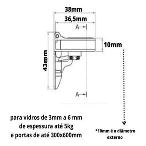 Material: aço inox com acabamento cromado. Indicada para portas de vidro com espessura de 3mm a 6mm. Não requer furação no vidro para sua instalação. Proteção de ventosa nos parafusos para fixação segura do vidro. Dimensões recomendadas para utilização: até 300x600mm ou peso menor a 5 kg.