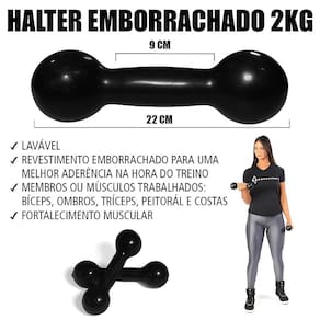 O par de halter é fabricado em ferro fundido e revestido com PVC com os mais exigentes padrões de qualidade e com alta tecnologia. Os halteres são emborrachados para uma melhor aderência na hora do treino. Tem sua superfície impermeável e possui uma variação de peso de acordo com a necessidade do usuário. Com o revestimento em PVC você terá muito mais conforto e higiene na utilização do produto. Possui um tamanho proporcional para o encaixe perfeito em suas mãos, oferecendo melhor conforto na hora da execução dos exercícios.