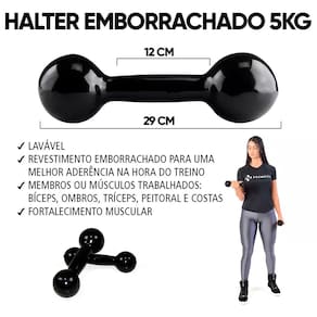 O par de halter é fabricado em ferro fundido e revestido com PVC com os mais exigentes padrões de qualidade e com alta tecnologia. Os halteres são emborrachados para uma melhor aderência na hora do treino. Tem sua superfície impermeável e possui uma variação de peso de acordo com a necessidade do usuário. Com o revestimento em PVC você terá muito mais conforto e higiene na utilização do produto. Possui um tamanho proporcional para o encaixe perfeito em suas mãos, oferecendo melhor conforto na hora da execução dos exercícios.