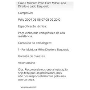 Par moldura farol milha palio siena strada g3 2003 04 à 2010 grade moldura palio siena strada com milha lado direito e lado esquerdocompatível:palio siena strada:ano 2003 04 05 06 07 08 09 2010especificação técnica:peça elaborada com plástico de alta resistência.Conteúdo da embalagem:1 - par moldura milha lado direito e lado esquero garantia de 3 mesesvalor unitárioobs: recomendamos que a instalação seja feita por um profissional, pois não nos responsabilizamos pelo mau uso da peça.