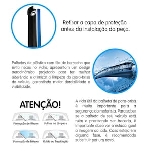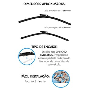 ESPECIFICAÇÕES TÉCNICAS: - Haste em plástico semirrigido que se ajusta ao vidro; - Fita de borracha; - Proporciona maior aderência e limpeza; - Evita riscos no vidro; - Menos ruídos no seu funcionamento; - Fácil de instalar; - Excelente durabilidade e acabamento; - Lado do motorista com 22 Polegadas 560mm ; - Lado do passageiro com 20 Polegadas 510mm ; - Para veículos com encaixe tipo GANCHO ESTENDIDO; - Substitui a palheta convencional; - Peso: 200 gramas.