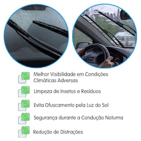 CARACTERÍSTICAS: - Melhor Visibilidade em Condições Climáticas Adversas: O limpador para-brisa ajuda a remover chuva, granizo, poeira e sujeira do para-brisa, melhorando a visibilidade do motorista em condições climáticas adversas; - Limpeza de Insetos e Resíduos: Com o auxílio do esguicho de água, remove facilmente insetos, resíduos de pássaros e outras sujeiras que podem se acumular no para-brisa durante a condução; - Evita Ofuscamento pela Luz do Sol: Ajuda a manter o para-brisa livre de manchas e reflexos causados pela luz solar direta, o que pode atrapalhar a visão do motorista; - Segurança durante a Condução Noturna em Chuvas: Garante que o para-brisa esteja limpo e claro durante a condução noturna, melhorando a segurança nas estradas. - Manutenção Preventiva: A manutenção regular dos limpadores para-brisa pode prolongar a vida útil do para-brisa, evitando riscos e danos causados por sujeira acumulada. - Redução de Distrações: Evita que o motorista se distraia ao tentar limpar manualmente o para-brisa, permitindo que ele se concentre na direção. - Conforto do Motorista e Passageiros: Proporciona um ambiente mais confortável para motoristas e passageiros, mantendo o para-brisa limpo e livre de obstruções visuais.