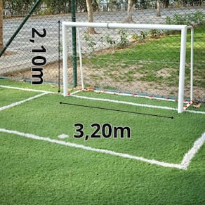 Cada rede tem 3,2 metros de comprimento e 2,1 metros de altura, atendendo às especificações padrão para o futsal. O polietileno virgem proporciona resistência a intempéries, garantindo que essas redes durem por muitas partidas.
