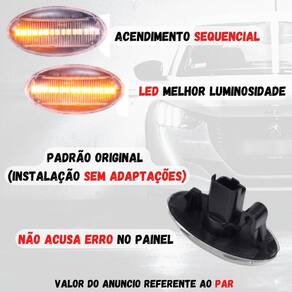 P: Acusa algum erro no painel do carro? R: Não, o Par Seta Pisca Sequencial Peugeot 207 Lâmpada Transparente é compatível com as versões que possuem a seta no para-lama, não acusando erros no painel.