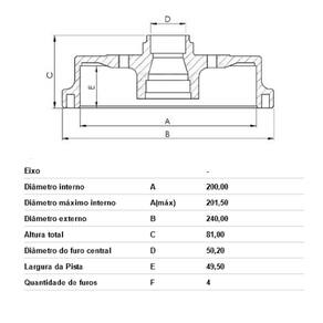 CARACTERÍSTICAS: Traseiro Com Cubo Diâmetro interno A 200,00 Diâmetro máximo interno TH(min) 201,50 Diâmetro externo B 240,00 Altura total C 81,00 Diâmetro do furo central D 50,20 Largura da pista E 49,50 Quantidade de furos F 4