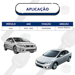Aplicação: Montadora: Honda Veículo: Civic Ano: 2012 a 2016 Direção: Assistida elétrica Posição: Dianteira – Lado direito ou esquerdo