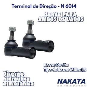 Par de Terminais de Direção Dianteiro Direito/Esquerdo Nakata Fiat Uno/Premio/Elba/Fiorino Itens inclusos: 02 Terminal de Direção Nakata N-6014 Aplicação: Fiat Duna 1993 a 2003 – Direção Hidráulica/Mecânica Fiat Elba 1992 a 1996 – Direção Hidráulica/Mecânica Fiat Fiorino 1992 a 2013 – Direção Hidráulica/Mecânica Exceto Trekking e Working Fiat Premio 1992 a 1993 – Direção Hidráulica/Mecânica Fiat Uno 1992 a 2012 – Direção Hidráulica/Mecânica O que é essa peça? O terminal de direção é uma junção esférica que faz a ligação entre a caixa de direção e as rodas. Ele permite que as rodas se movimentem lateralmente, acompanhando os comandos do volante com flexibilidade e segurança. Para que serve? A função do terminal de direção é transmitir os movimentos do volante para as rodas, permitindo que o veículo vire com precisão. Ele compensa desníveis e movimentos da suspensão sem perder o controle da direção. Sinais de desgaste: Folga na direção Ruídos metálicos ao esterçar Dificuldade em manter a direção alinhada Desgaste irregular dos pneus Ao identificar esses sintomas, é recomendável verificar e, se necessário, substituir o terminal de direção imediatamente. Detalhes do produto: Posição: Direita / Esquerda / Lado a lado Rosca: Externa / Interna – especificar Aplicação: Inserir novamente montadora, veículo e ano Peso aproximado: Inserir peso em gramas Código de fábrica: Inserir referência Código de barras: Inserir EAN se disponível Atenção: Certifique-se de que esta é a peça correta para seu veículo verificando todos os dados de aplicação. Em caso de dúvida, nosso atendimento está à disposição. Garantia: 90 dias de garantia direto com o fabricante em caso de defeito de fabricação. Troca e devolução: A troca ou desistência da compra deste item pode ser feita em até 07 dias corridos a partir do recebimento do produto. O produto deve estar em perfeitas condições, sem uso ou danos. Dúvidas frequentes: