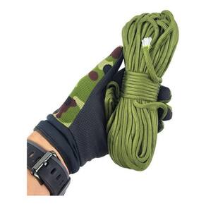 - O paracord 550 é composto por uma capa e sete cordinhas internas mais finas, cada uma delas é feita de dois fios individuais trançados. - Sua resistência é de 550 libras. - O paracord quando é separado em cordinhas é frequentemente utilizado em situações de sobrevivência, campings, em construções na selva, armadilhas, pendurar rede ou lona para uso como telhado, cadarço, corda de arcos, rede trançada de pesca, linha de costura, linha de pesca, fixar equipamentos ou acessórios a mochilas, fixar pontas de flecha para caça improvisadas nas hastes, situação em que comumente é usada em conjunto com alguma cola de origem vegetal ou animal. Medidas: Comprimento Total: 29 M Peso: 130g 100% Poliamida Nylon com 7 filamentos no interior Carga: 30kg Espessura: 4 mm