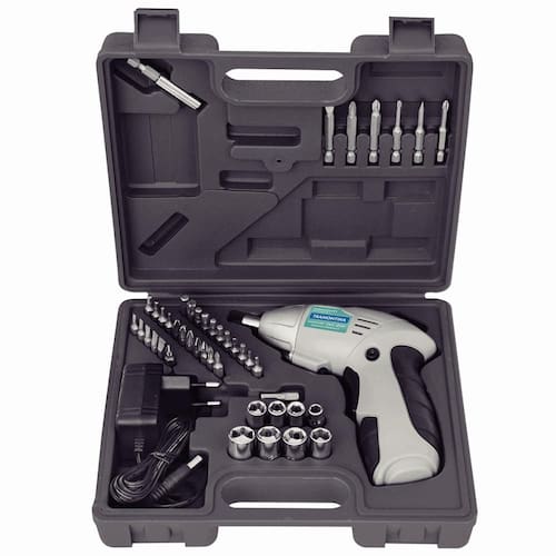 - Chega de brigar com as chaves de fenda! A Parafusadeira Tramontina 1/4 de Polegada para Uso Doméstico a Bateria Ni-Cd 4,8 V com Maleta e 46 Peças é ideal para o trabalho de apertar e soltar parafusos em madeiras.