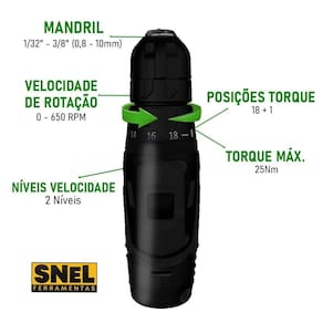Parafusadeira Com Impacto Furadeira A Bateria 12V Com 19 Posições Torque Bivolt Mandril de 12 e 38 Snel FerramentasA Parafusadeira Furadeira Snel é equipada com uma bateria de Lítio 12V e mandril de 38, incluindo LED para iluminação integrada e indicador de carga, facilitando a visibilidade durante o uso. Com 19 posições de torque, oferece velocidade variável e rotação reversível, alcançando até 650 RPM. Além disso, conta com a função de Furadeira de Impacto, proporcionando ainda mais potência à ferramenta. Acompanha uma prática maleta, bits e brocas.Desenvolvida para aplicações domésticas, de hobby ou profissionais, é ideal para parafusar e perfurar superfícies de alvenaria, madeira e plástico. Dados Técnicos: Marca: Snel Bateria: 12V Capacidade: 1500 mAh Tempo de Carga: 3 6 Horas Velocidade de Rotação: 0 650 RPM Mandril: 132 38 0,8 10mm Torque Máximo: 25Nm Níveis de Velocidade: 2 Peso: 1Kg Led: Sim Posições de Torque: 18 1 Reversível: Sim Acompanha Carregador