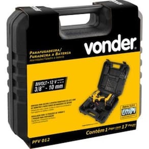 Parafusadeira E Furadeira De Bateria Vonder Pfv012 12V C/Maleta - Amarela - Bivolt Indicada para soltar e apertar parafusos de até 6 mm de diâmetro e fazer furos em madeiras ou metais. Tempo de carregamento da bateria: 3 a 5 horas. Possui regulagem para 18 posições de torque e 1 posição para perfuração, LED para melhor visibilidade do local de trabalho, cabo com revestimento emborrachado, proporcionando maior conforto ao operador, bateria de íons de lítio que confere alta eficiência de operação, indicador de carga da bateria, além de fonte bivolt automática com tensão de entrada de 100V - 240V Marca: Vonder Modelo Pfv-012 Ref.: 60.01.012.000 Bateria: 12 V - 1,3 Ah - Íons de lítio Capacidade do mandril: 3/8 - 10 mm Tipo de velocidade: Variável Tipo de mandril: Aperto rápido Rotação da Furadeira/parafusadeira: 0 - 650/min Sistema de reversão: Reversível Capacidade máxima de perfuração em aço: 10,0 mm Capacidade máxima de perfuração em madeira: 16,0 mm Capacidade de furação no concreto/alvenaria: N/A Impactos por minuto ipm : N/A Tensão do carregador de bateria: 100 V - 240 V - Bivolt automático Frequência: 50 Hz/60 Hz Nível de vibração m/s : 1,298 m/s Incerteza k m/s : n/a Massa aproximada.: 1,0 Kg Conteudo da Embalagem:1 maleta1 bateria de 12 V6 brocas de aço rápido6 bits1 soquete magnético encaixe de 1/41 carregador bivolt automático Bateria: 12 V - 1.3 Ah - Íons de lítiCapacidade máxima de perfuração em aço: 10 m Cor: Amarela e Preto - Voltagem: Bivolt Garantia de 12 meses contra defeitos de fábrica.