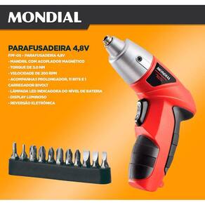 Parafusadeira Elétrica Mondial 4,8V Bivolt FPF-05 Seja um profissional na sua própria casa. A parafusadeira 4,8V Recarregável da Mondial é a ferramenta mais versátil. Ela possui mandril com fixador magnético, torque de 3Nm para remover parafusos facilmente, Velocidade de 200rpm para que você possa realizar diversos tipos de serviços tranquilamente, display luminoso que indica o nível de bateria, lâmpada Led para facilitar o trabalho em pontos mais escuros, reversão eletrônica permitindo o giro para os dois lados e bateria interna proporcionando mais mobilidade no manuseio. Além disso, a Parafusadeira 4,8V é à bateria, chega de fios. Características:- Mandril com acoplador magnético;- Torque de 3.0 Nm;- Velocidade de 200 rpm.- lâmpada LED indicadora do nível de bateria;- Display luminoso;- Reversão Eletrônica. Itens Inclusos:- 1 prolongador;- 11 bits;- 1 carregador bivolt.