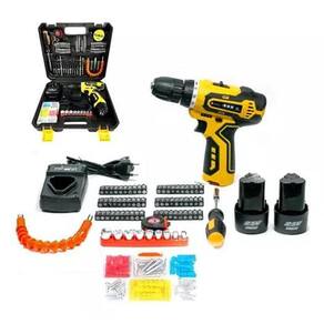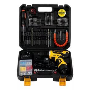 - 02 baterias de lítio 2v - 01 carregador de mesa bivolt; - 01 ponta dupla para parafusar - 13 brocas - 60 bits - 01 adaptador para extensor - 01 alongador 25cm flexível - 09 soquetes sextavados - 01 estojo com parafusos e buchas -01 trena - 01 fita isolante - 01 chave manual